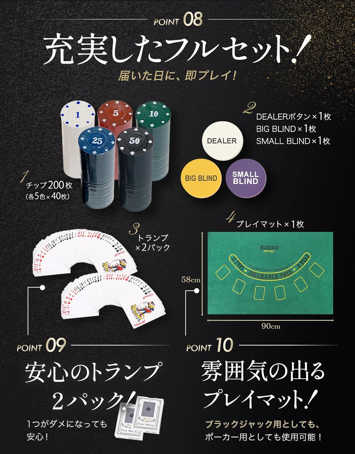 本景品は、ポーカー初心者から経験者まで幅広く楽しめるよう、必要なアイテムをすべて揃えたオールインワン仕様。開封したその日から、すぐに本格的なポーカープレイを始められます。