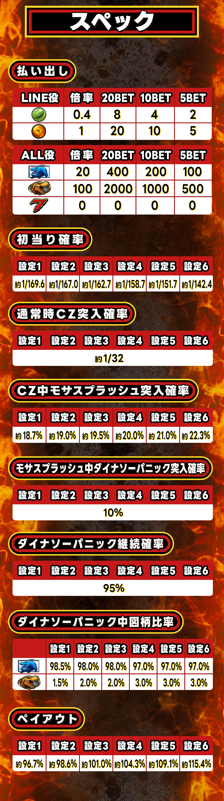 8ラインスロット「ダイナソー★パラダイス!!」では1回のゲームで5ptまたは5枚/10枚/20枚のスロットメダルをベットすることができ、対応するラインに各絵柄が揃うと払出しを受けることが出来ます。